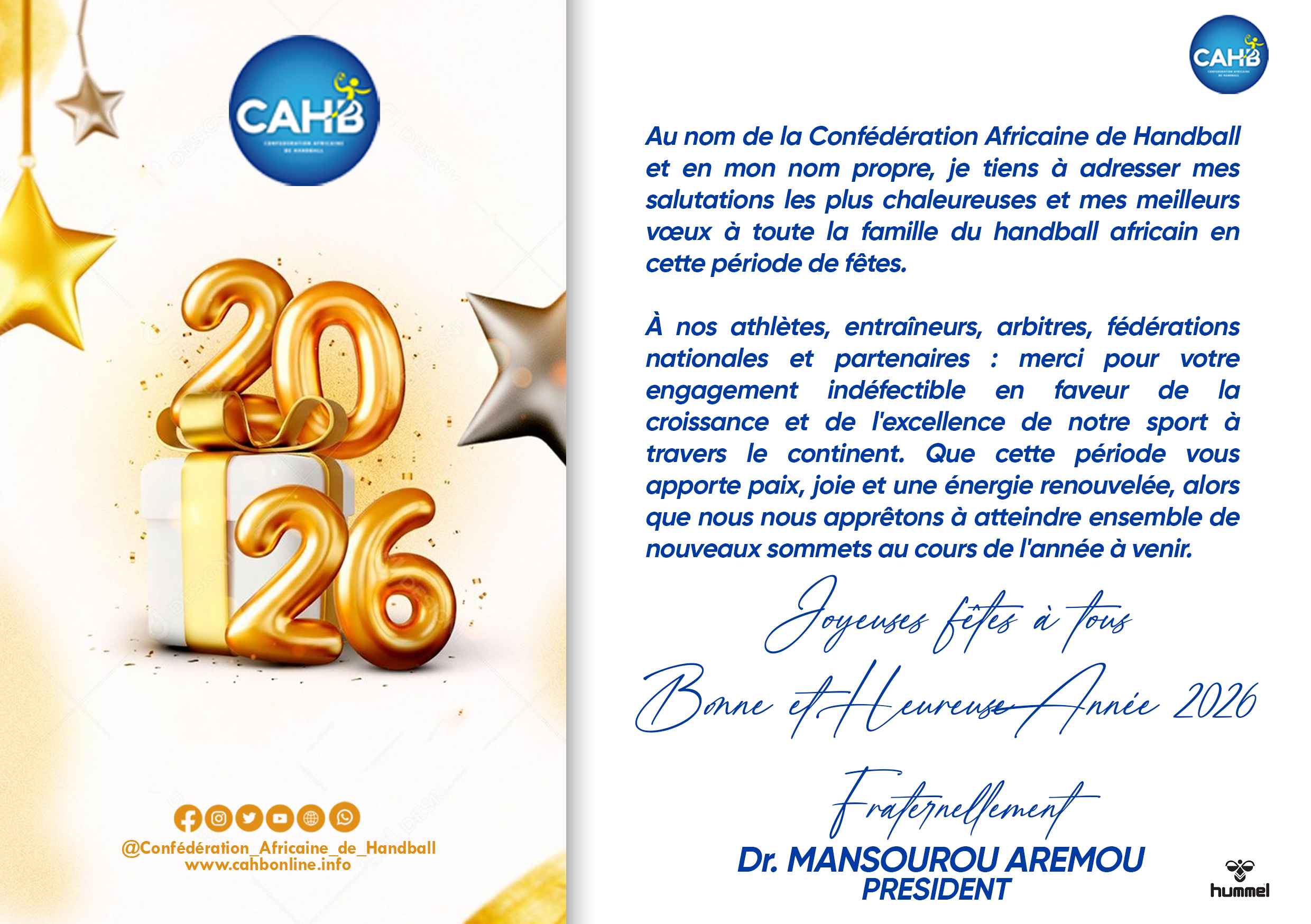 Au nom de la Confédération Africaine de Handball et en mon nom propre, je tiens à adresser mes salutations les plus chaleureuses et mes meilleurs vœux à toute la famille du handball africain en cette période de fêtes.